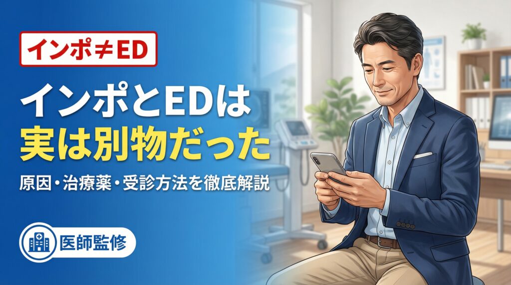 「最近、勃起しにくくなった」「勃起しても硬さが足りない」「中折れしてしまう……」そんな悩みを抱えていませんか?こうした症状を指す言葉として、「インポ(インポテンツ)」と「ED(勃起不全・勃起障害)」の2つがよく使われますが、実はこの2つはまっ... -