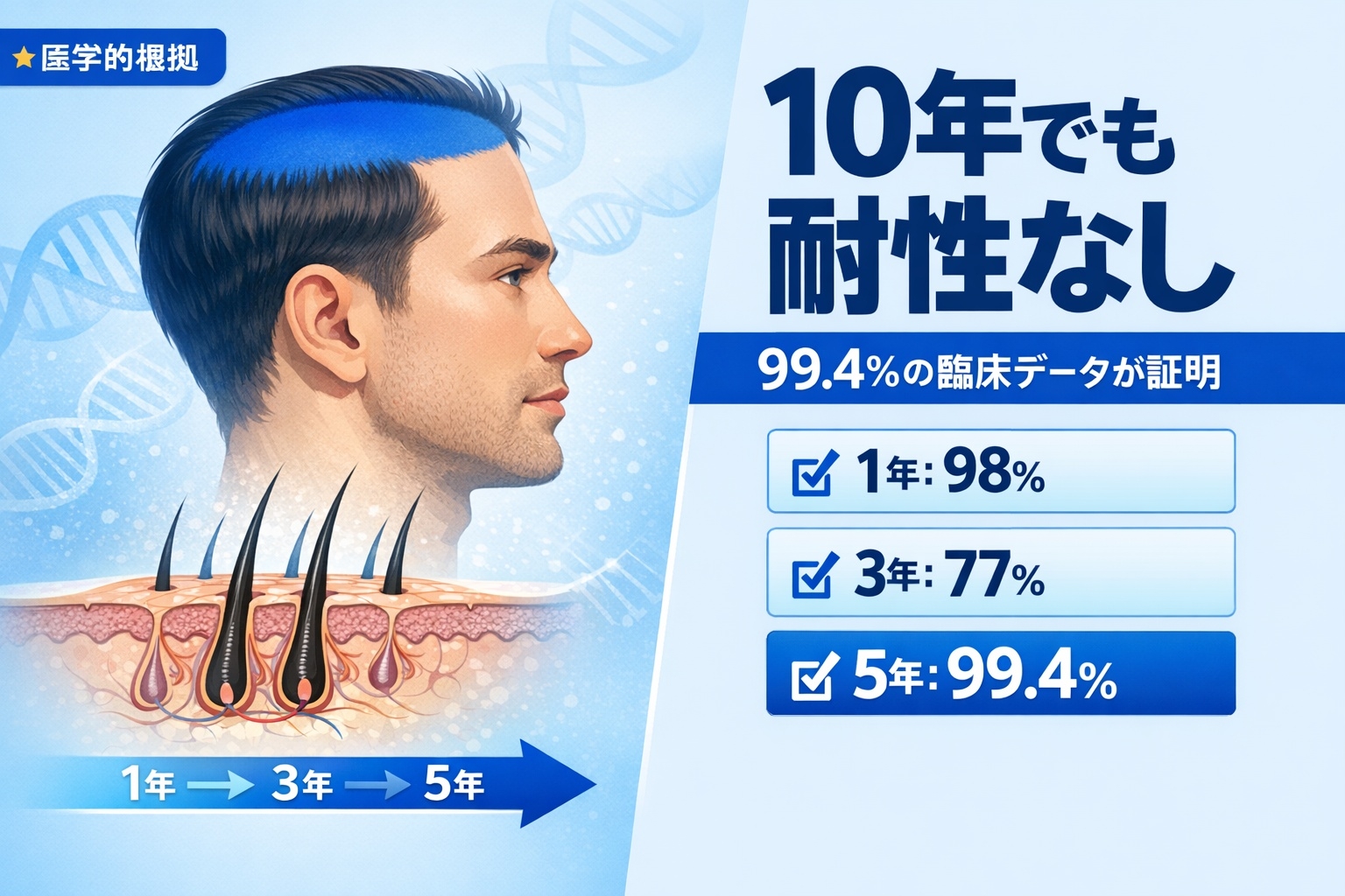 【医学的事実】 プロペシア(フィナステリド)は、1998年に世界で初めて承認されて以来、25年以上にわたり使用されています。この間の膨大な臨床データと患者の経験から、耐性の発生は認められていません。むしろ、長期継続使用によって効果が安定し、その効果が持続することが確認されています。