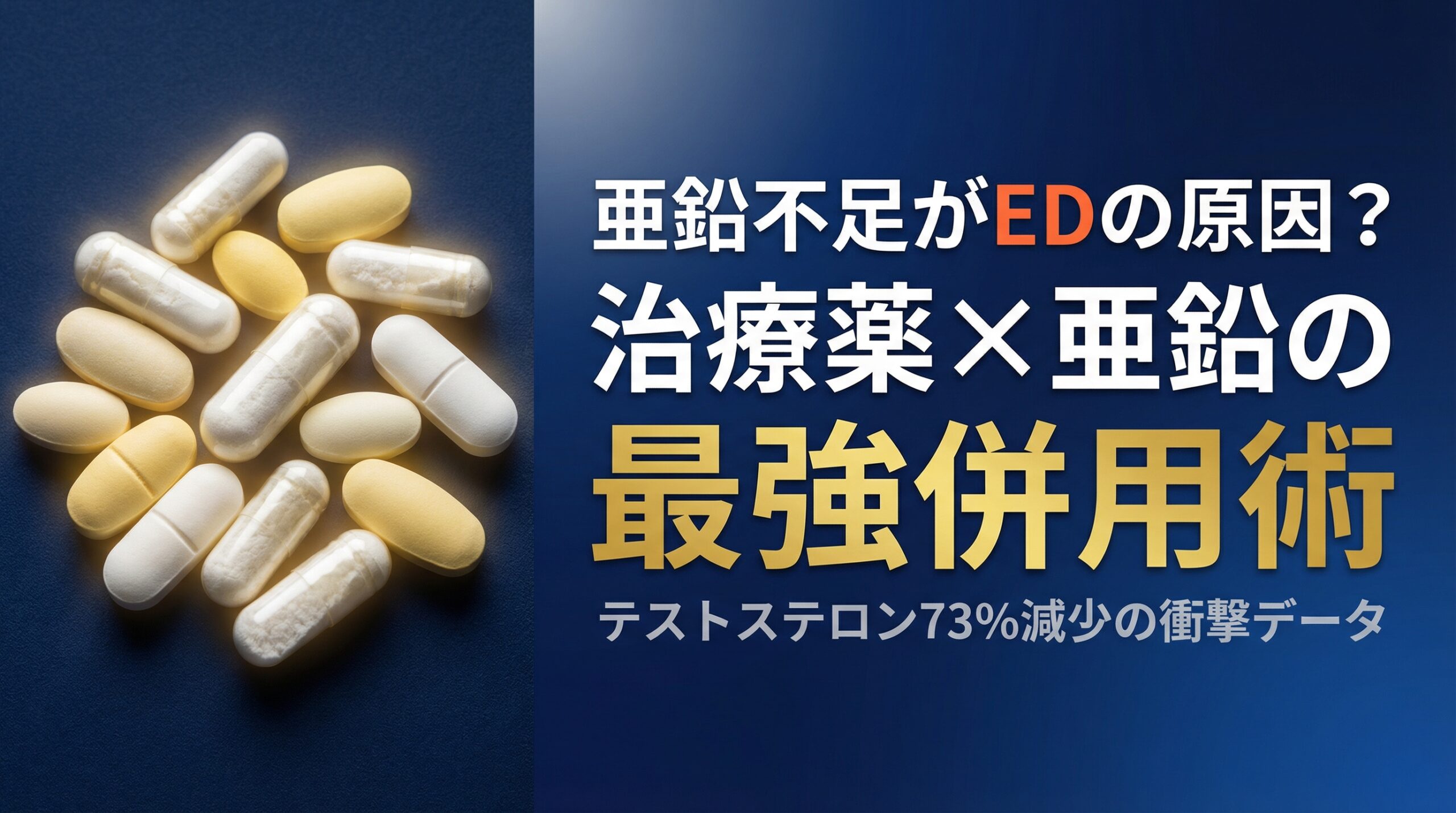 「最近、自信が持てなくなった」「以前のような元気がない」――そんな悩みを抱える男性は少なくありません。実は、その原因のひとつに「亜鉛不足」が深く関わっていることをご存じでしょうか。亜鉛は男性ホルモン(テストステロン)の生成に不可欠な必須ミネラルであり、不足すると性欲減退や勃起力の低下、さらにはED(勃起不全)の発症リスクを高めることが研究で示されています。厚生労働省のデータによると、日本人成人男性の亜鉛摂取量は推奨量を下回っており、多くの男性が知らないうちに亜鉛不足に陥っているのが現状です。本記事では、亜鉛不足とEDの医学的メカニズムをわかりやすく解説するとともに、ED治療薬との併用による相乗効果や、吸収率を高める正しい亜鉛の摂り方まで、専門医監修のもと徹底的にお伝えします。「ED治療薬+亜鉛」の二刀流で、根本からの男性機能改善を目指しましょう。