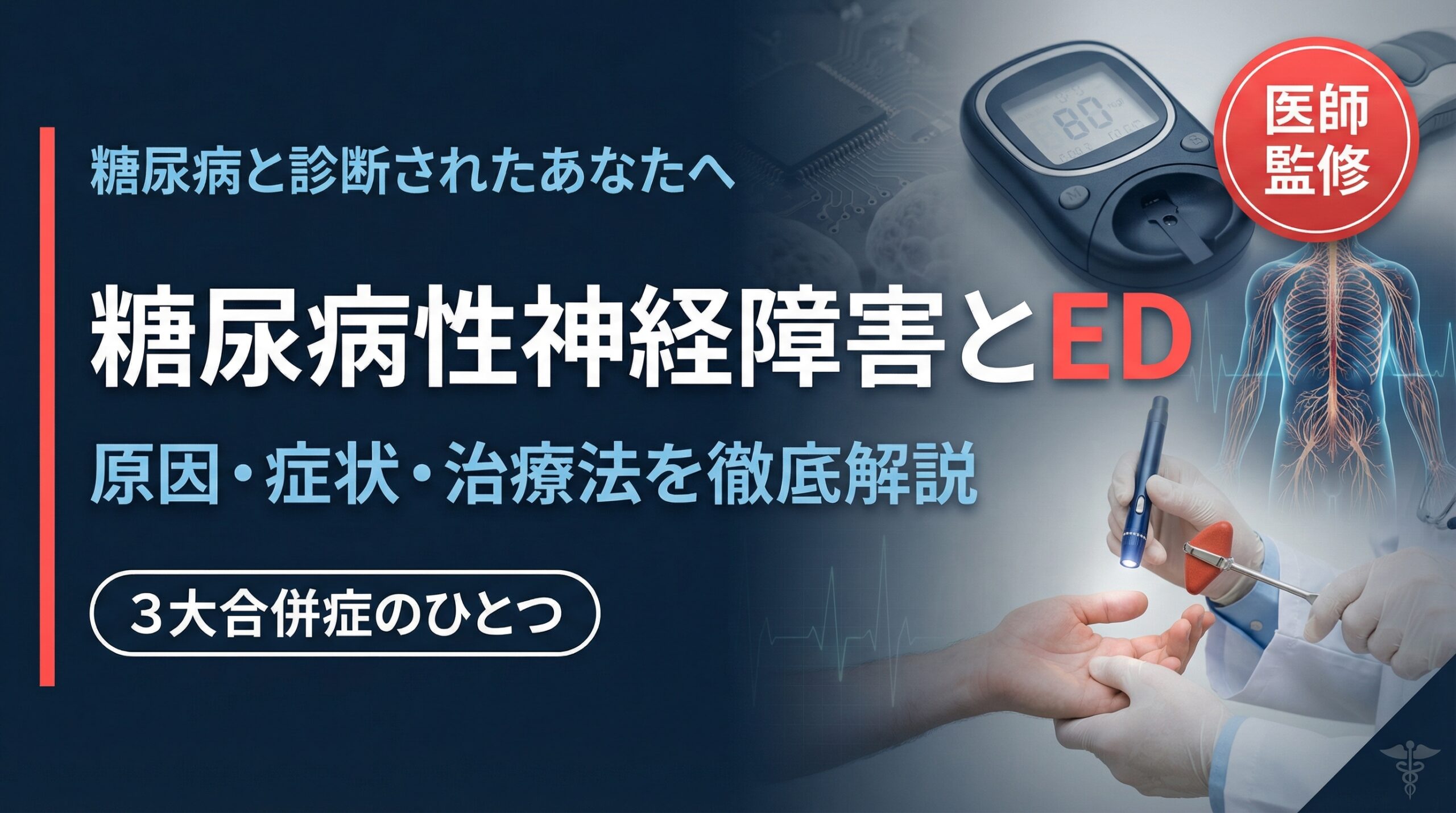 糖尿病と診断されてから、なんとなく夜の自信が持てなくなったと感じていませんか? 実は、糖尿病の患者さんの多くが抱えるこの悩みには、血糖値だけでなく「神経の障害」が深く関わっています。 糖尿病性神経障害は、高血糖が長期間続くことで末梢神経が傷つき、手足のしびれや感覚の鈍麻、さらには勃起障害(ED)を引き起こす、糖尿病の3大合併症のひとつです。 「年齢のせいかな」「疲れているだけかも」と見過ごされがちですが、実は神経障害が原因であるケースは非常に多く、適切な治療を受ければ改善できる可能性があります。 本記事では、糖尿病性神経障害のメカニズムから種類・症状、そしてEDとの関係や治療法まで、医学的な根拠をもとにわかりやすく解説します。 糖尿病とEDの両方に悩む方にこそ、ぜひ最後まで読んでいただきたい内容です。