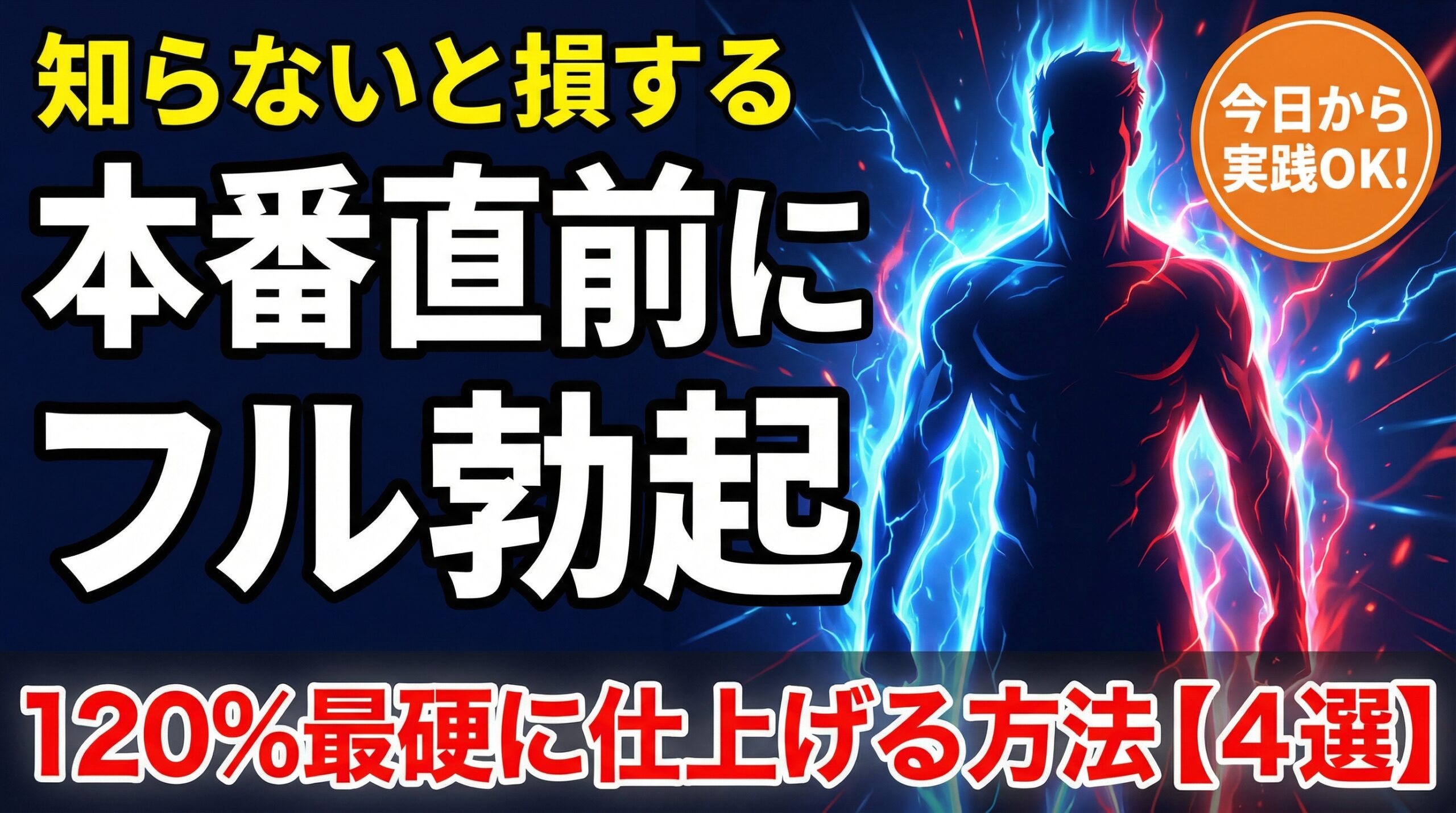 この記事では、泌尿器科や性機能の専門知識をもとに、本番直前にできる勃起力を120%に高める具体的な方法を4つ厳選してご紹介します。特別な道具もサプリも一切不要。今日からすぐに実践できる習慣・食事・メンタルコントロール・体の使い方を徹底解説します。